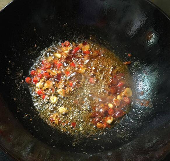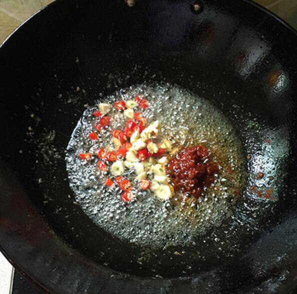 7.锅中留底油,下小米椒、大蒜和豆瓣酱。