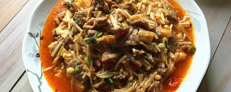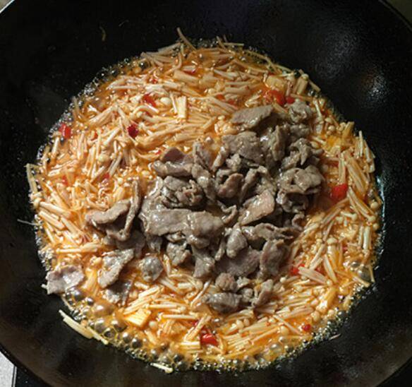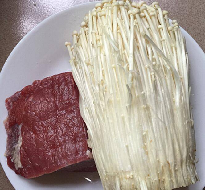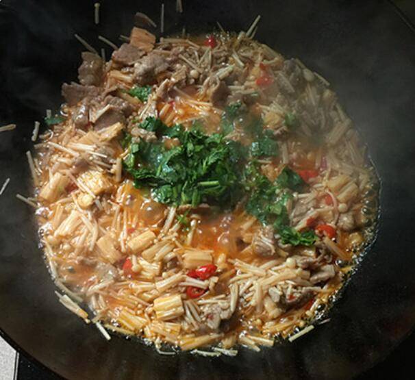 用料:牛肉200克、金针菇300克、料酒10毫升、蒸鱼豉油10毫升、胡椒粉1克、玉米淀粉2克、豆瓣酱10克、小米椒2个、大蒜8克、食用油30毫升、香菜1根。