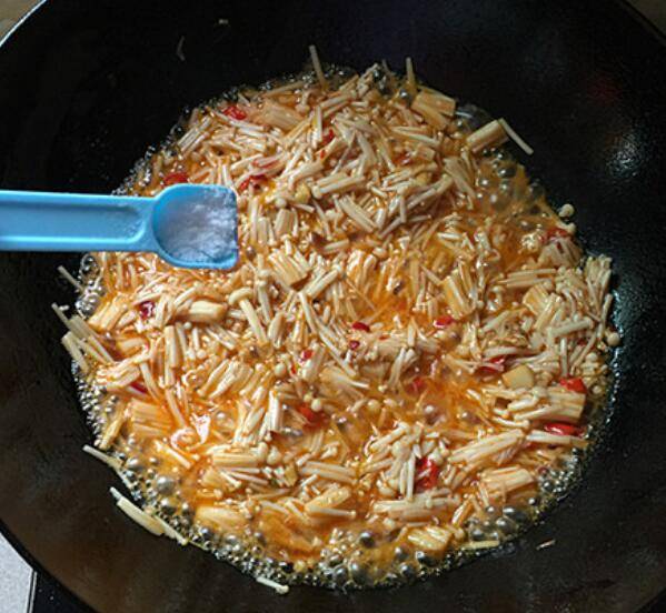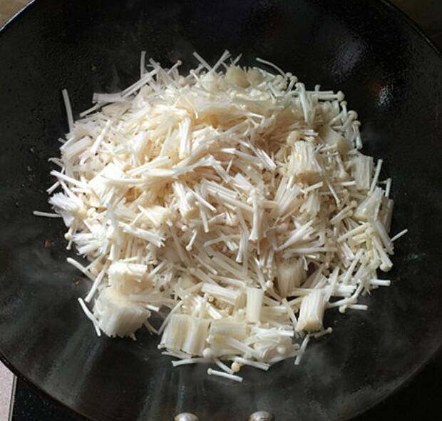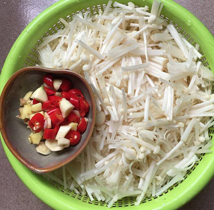 4.金针菇除掉根部,洗净后切寸段;小米椒、大蒜切碎。