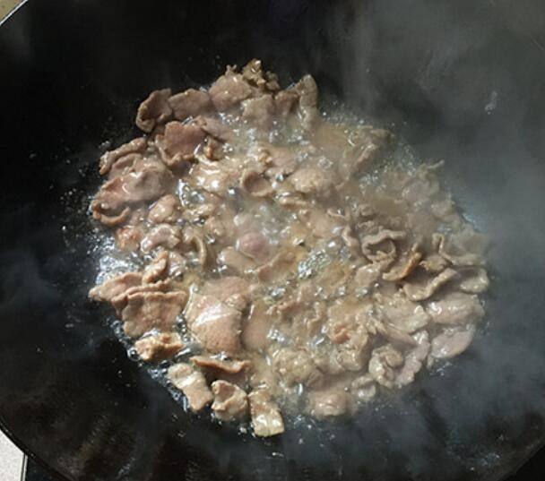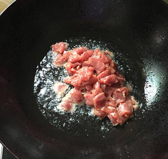 5.炒锅中注入食用油,5成热时下腌好的牛肉。