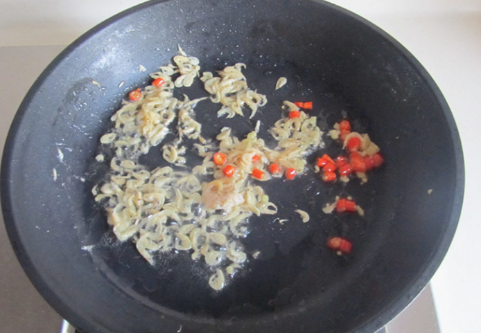 1、准备食材:萝卜2根、虾皮1把、红辣椒2个、姜2片、小葱1根、油盐适量。