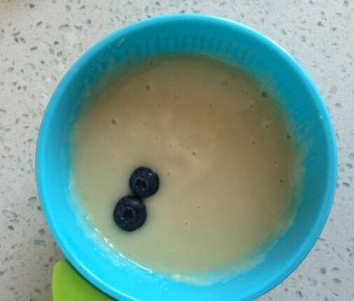 3、5勺米糊,80度水冲开搅匀,和熟苹果一起倒进料理机打糊。