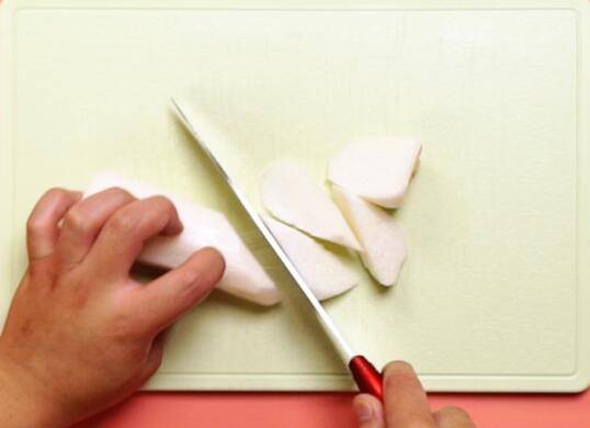 4、把山药先斜切成段,然后再切成菱形片。