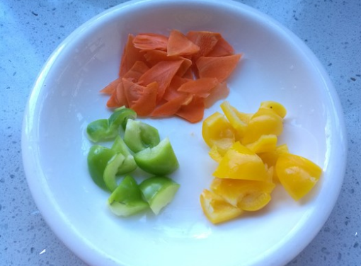 3、青椒、黄色甜椒分别清洗干净,切成小块。胡萝卜洗净去皮切成片,胡萝卜切成片比较容易成熟。