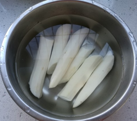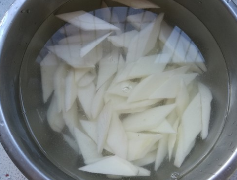 5、切成菱形片的山药继续泡在水里,不用放醋,或者柠檬,山药只要不接触空气就不会氧化变色。