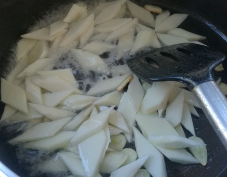 6、炒锅烧热,倒入适量的食用油,下入葱花、蒜片炒出香味,把山药片放进去,翻炒均匀。