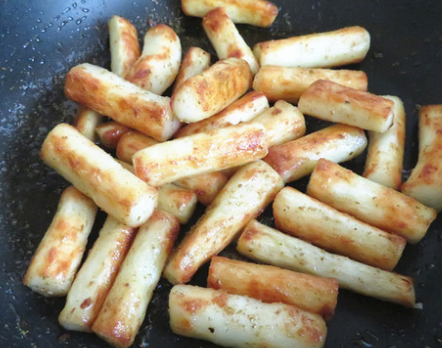 3、取出放入烧热油的锅中小火慢煎,煎至各面金黄,加入盐、孜然粉拌匀即可。