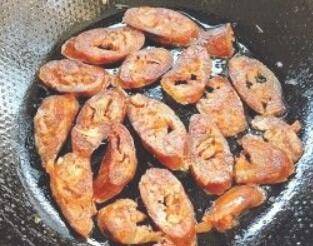 起锅热一点油,油热转小火放入腊肠慢慢煸炒,煸出腊肠多余的油脂。