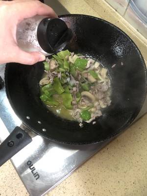 用料:青椒2个、肉丝200克、姜2片、盐适量、蘑菇5-6个。