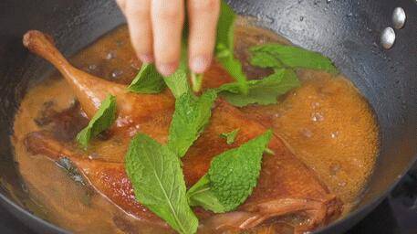 8、然后开盖加入剩余未切丝的薄荷叶,继续焖煮10-20分钟 · 煮至鸭腿可用筷子轻松插入,且没有血水流出,便表示熟透,可以出锅斩件。