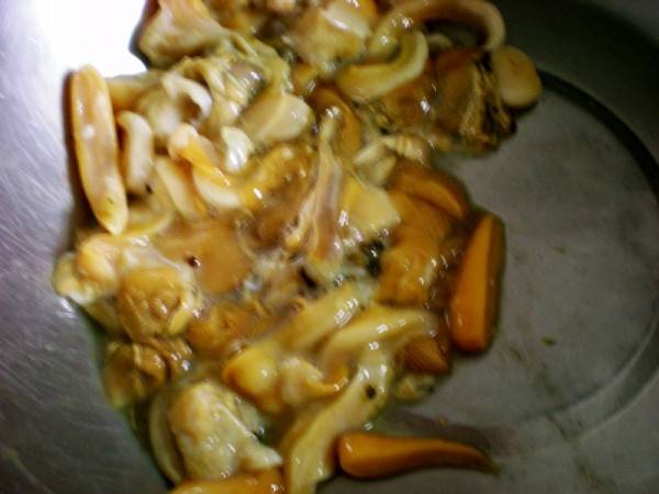 5、锅里继续放少量油,油热后加入河蚌肉翻炒1分钟,盛盘备用。