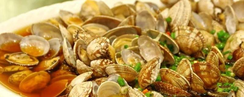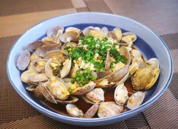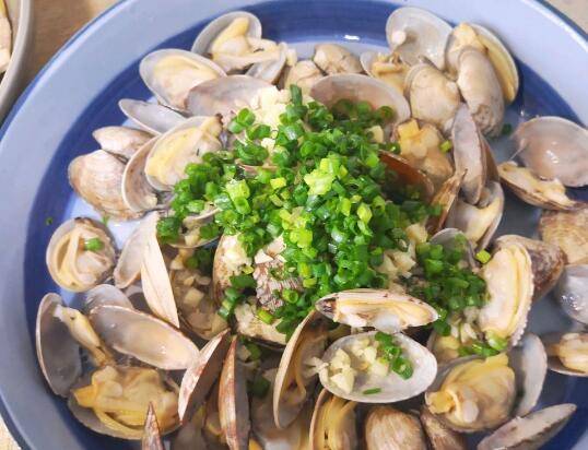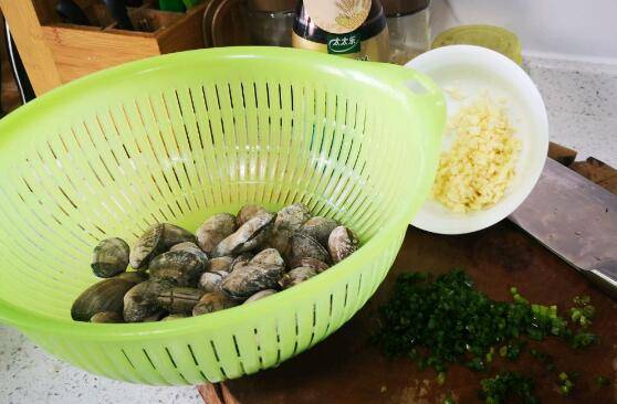 用料:花蛤一斤、葱花适量、大蒜末适量、蒸鱼豉油一勺、生姜一块、黄酒一勺。