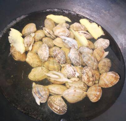 2、起锅沸水加入生姜、黄酒、花蛤。