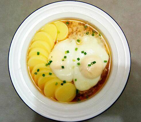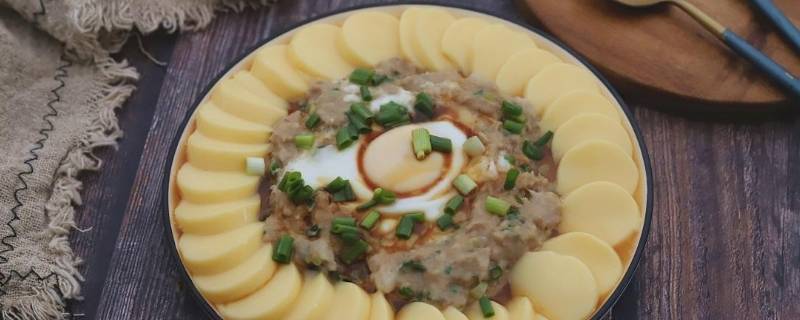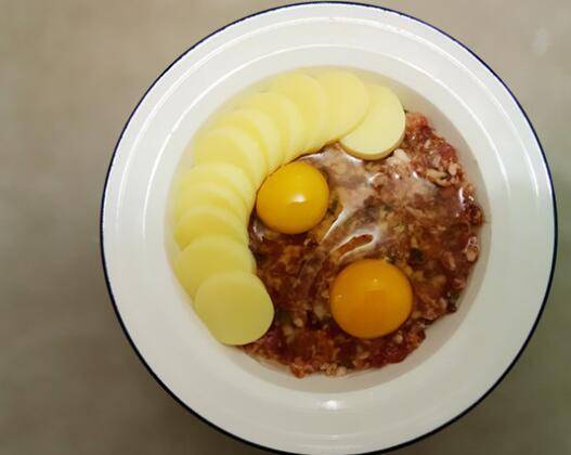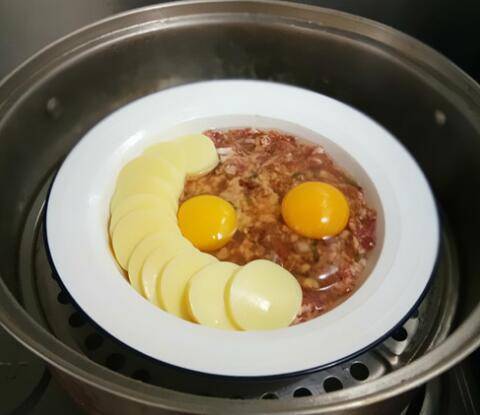 切好的日本豆腐顺着盘边均匀码在肉馅中,生鸡蛋也打在肉馅上。