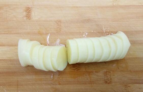 日本豆腐从中间切开挤出,切成半厘米厚的片。