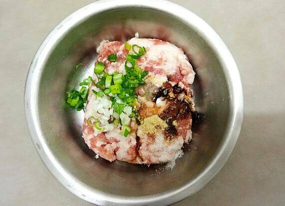 肉末中加入葱、姜粉、白胡椒粉、食盐、生抽、老抽、香油充分拌匀。