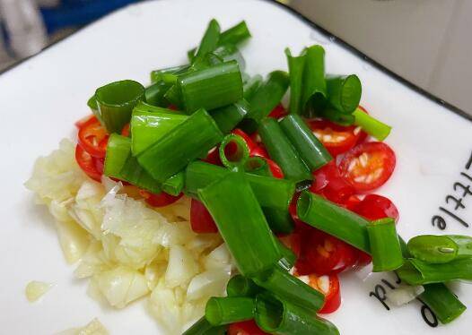 2、将蒜瓣切成粒,小米椒切成小辣椒圈,葱叶切成段。