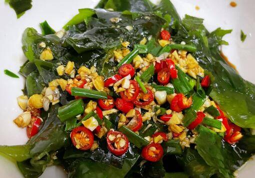 用料:干裙带菜50克、生抽一汤匙、陈醋一汤匙、蚝油一勺、白糖一勺、小米椒三个、花生油一勺、蒜2瓣、葱1根、盐10克。