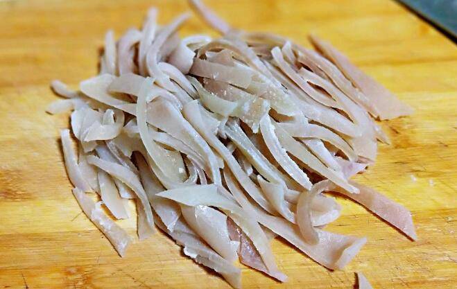 3、之后用刀把肉皮上的油脂刮干净。再将肉皮切丝,之后再切肉皮丁。