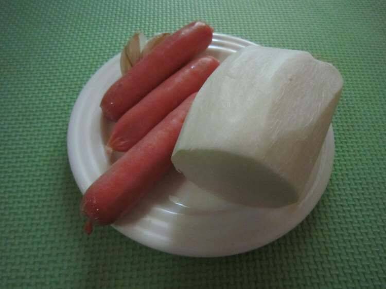 1、食材准备:白萝卜300克、香肠3条、油、盐、大蒜、蚝油、生抽各适量。