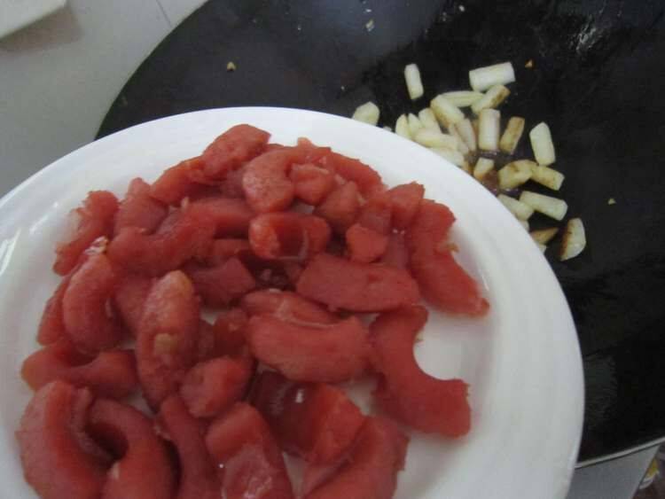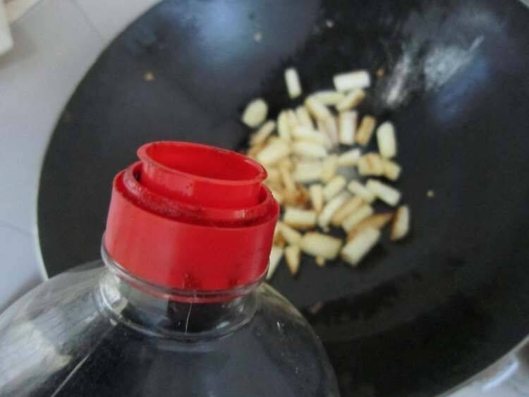 4、用余油煸香大蒜。
