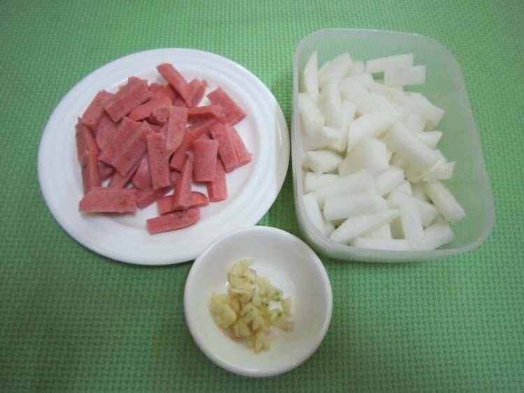 2、把香肠和萝卜切条,蒜切粒。