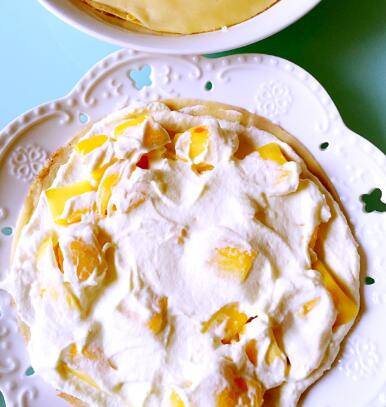 张面皮铺在盘子上。然后摸一层奶油,铺一层芒果,在抹一层奶油。依次类推。可以挑一张最好看的饼皮最上面一层用。光滑的一面朝上。