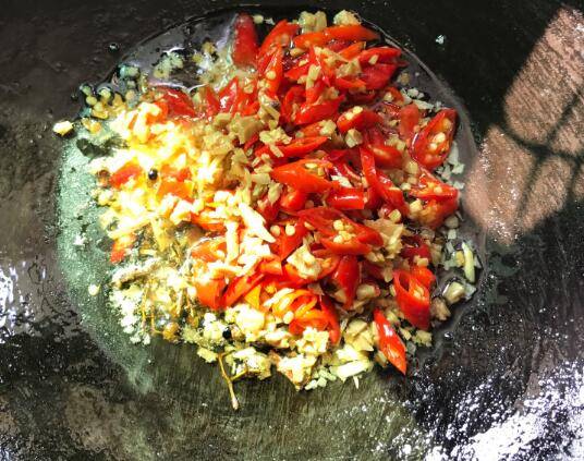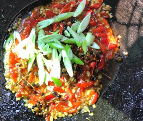 油7成热,下新鲜花椒、蒜末炒香。再放入泡姜、泡椒,小火熬上几分钟,让泡椒的辣味充分的释放出。