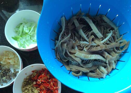 半小时后捞出牛百叶沥干水分,泡姜、蒜切末,泡椒、葱切片备用。
