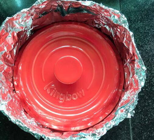 准备2张45-50厘米的锡纸交叉叠放,延锅盖边缘叠成碗状。