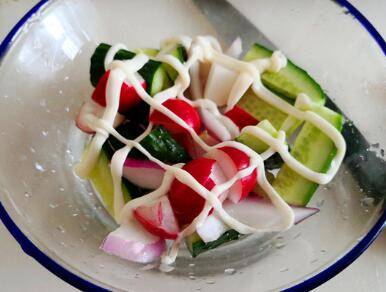 蔬菜沙拉做法:黄瓜1根、洋葱少许、樱桃萝卜3个、沙拉酱适量。