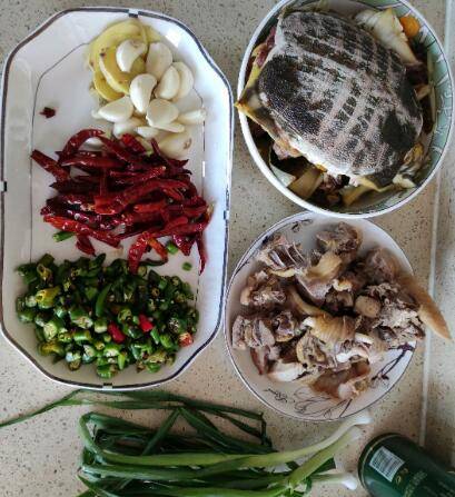 用料:甲鱼1只、鸡半只、火锅底料半块、啤酒两瓶、姜一块、大蒜10颗、小米椒20个、干辣椒一把、葱2根、香菜2根。