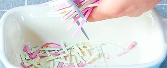 蔬菜面剪碎,入锅煮2分钟,捞出沥水。