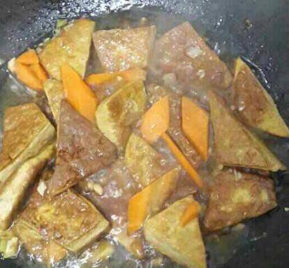 2、锅内不用放油,把锅烧热,改小火,下切碎的油饼,不停翻炒。