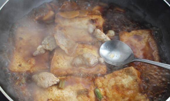 7、把豆腐码进去,五花肉倒进去,用一把勺子把汤汁舀起来浇在豆腐上,让豆腐都吸饱汤汁,小火慢熬,直到汤汁收的差不多了,水淀粉勾芡,洒上葱花出锅即可。