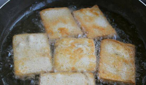 1、豆腐切成一厘米厚的片,用油炸成两面金黄,表面结成硬壳捞出备用。
