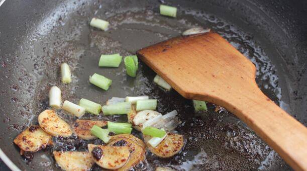 5、直接用锅里的油,放1汤匙豆瓣酱炒出味道,放入姜蒜煸香,再放入葱白,加入2汤匙料酒。