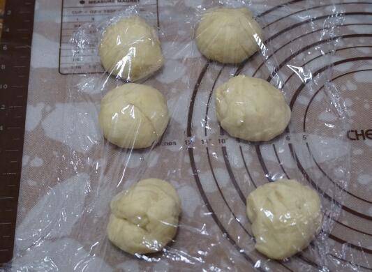7、分成六个大小均匀的小面团,盖上保鲜膜静置15分钟。
