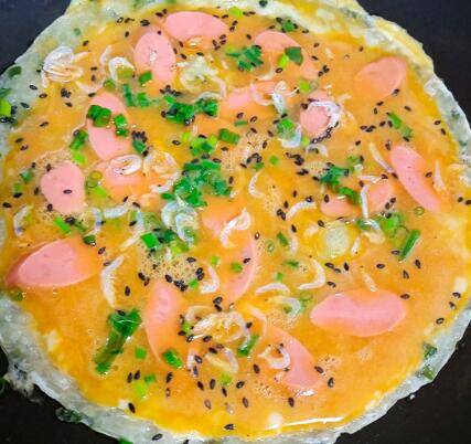 鸡蛋2个、手抓饼一张、葱适量、火腿肠1根、黑芝麻少许、虾皮适量。