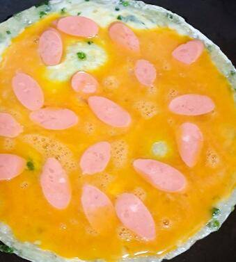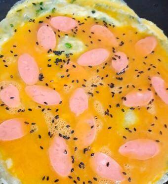 倒入鸡蛋液,铺上火腿肠,撒上黑芝麻。