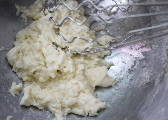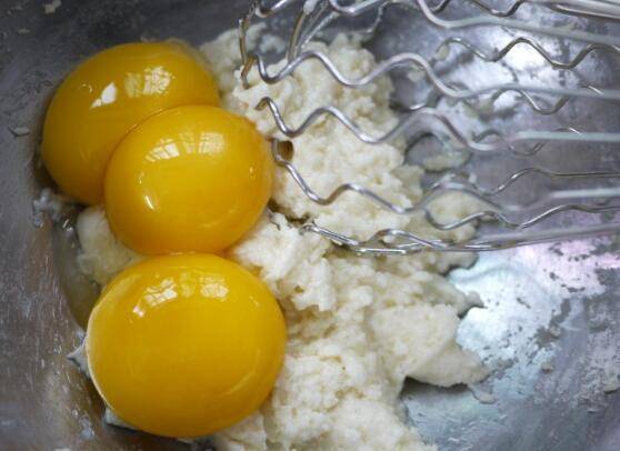 把蛋黄加入面糊里,搅拌至蛋黄和面糊均匀无颗粒状。