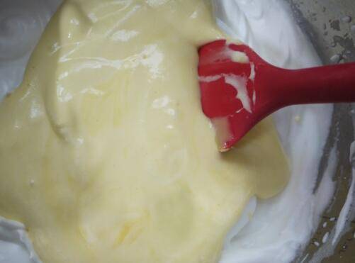 把混合均匀的蛋黄糊倒入剩余的蛋白霜中,快速翻拌均匀。
