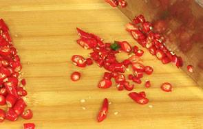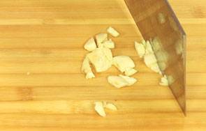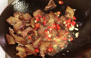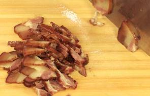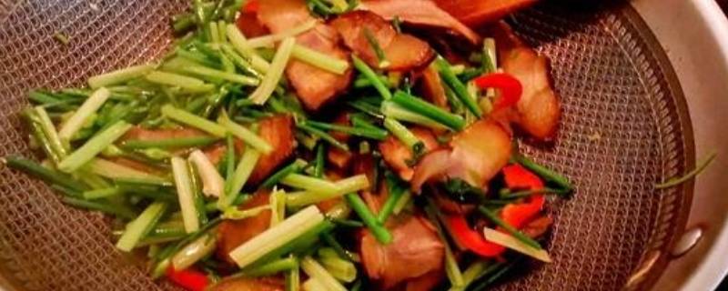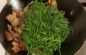 2、腊肉汆熟切片, 韭菜花洗净切段。