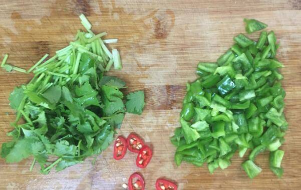 1、青椒切粒、香菜切小段备用。