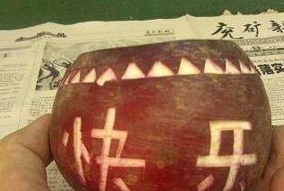 在萝卜上,可以刻一些吉祥的话语,也可刻一些漂亮的图案。