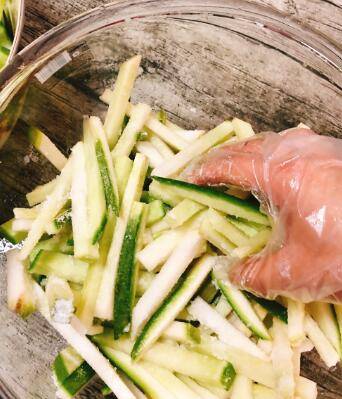 撒一些盐腌制出水,戴上一次性手套,抓均匀。