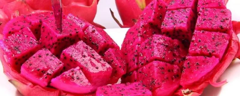 3、用刀把火龙果切成小方块,再倒在盘中即可。