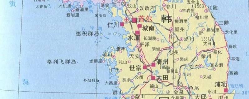 韩国在地图上的朝鲜半岛南部。朝鲜半岛地处亚洲大陆的东北部,自北向南延伸,全长1100公里。韩国的总面积为99000平方公里。韩国的领海与太平洋最西部的海域交汇。朝鲜半岛北部与中国和俄罗斯接壤,东部濒临东海,与邻国日本隔海相望。除与大陆相连的半岛之外,韩国还拥有3200个大小岛屿。