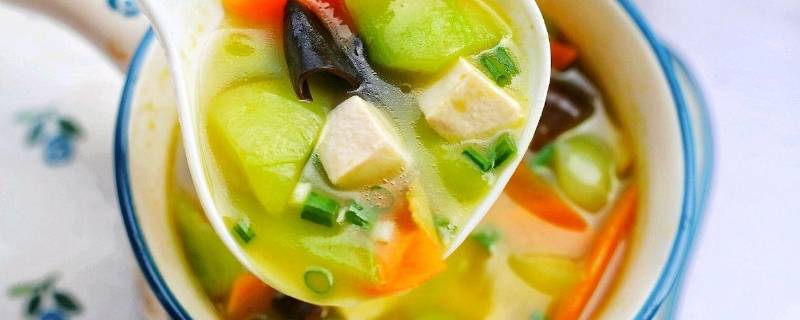 最佳答案1、准备食材:丝瓜1条、鸡蛋2个、豆腐1块、姜1片、葱1根、盐、油。2、豆腐切小块,放淡盐水中浸泡几分钟。3、丝瓜去丝去皮,切滚刀块;姜切丝,葱切末。4、鸡蛋先打散在碗里,锅中加水3碗,放入姜丝烧开。5、加入豆腐和丝瓜再滚开,在滚开处倒入蛋液搅拌。6、搅拌均匀后加盐、油和葱花即可。