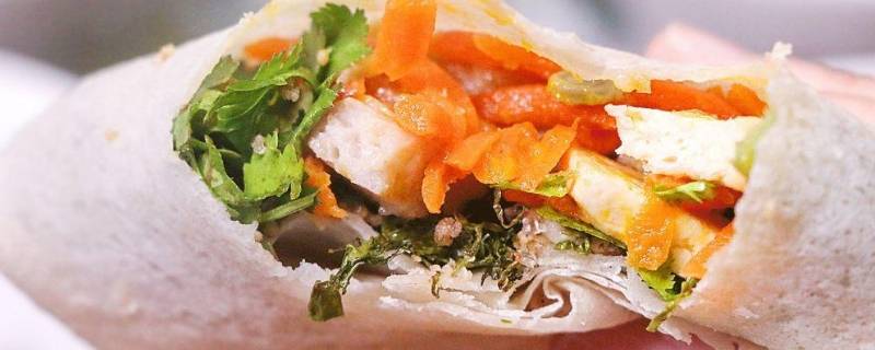 3、春菜洗净,润饼皮铺上香菜叶和内馅,包起来即可食用。